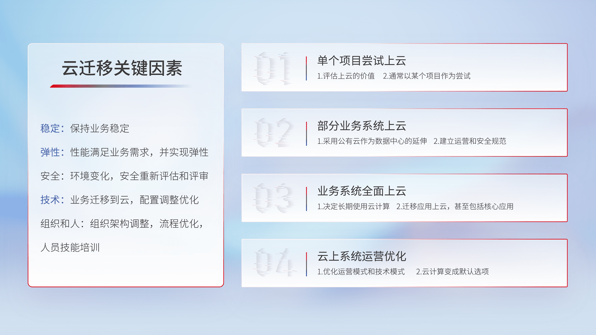 结合实际业务,,,,从规划设计、、云平台选型、、、云原生改造、、、、数据迁移、、集成交付,,,,迁移全过程为客户识别最佳上云路径,,,,做好风险识别管理,,,设计网络架构、、、、身份权限、、、安全审计合规、、操作审计、、日志审计、、、监控告警策略、、、、多站点容灾设计等,,对云上基础设施进行整体规划,,,,提升IT治理水平,,,以满足弹性、、高可用、、高性能的需求。。。。