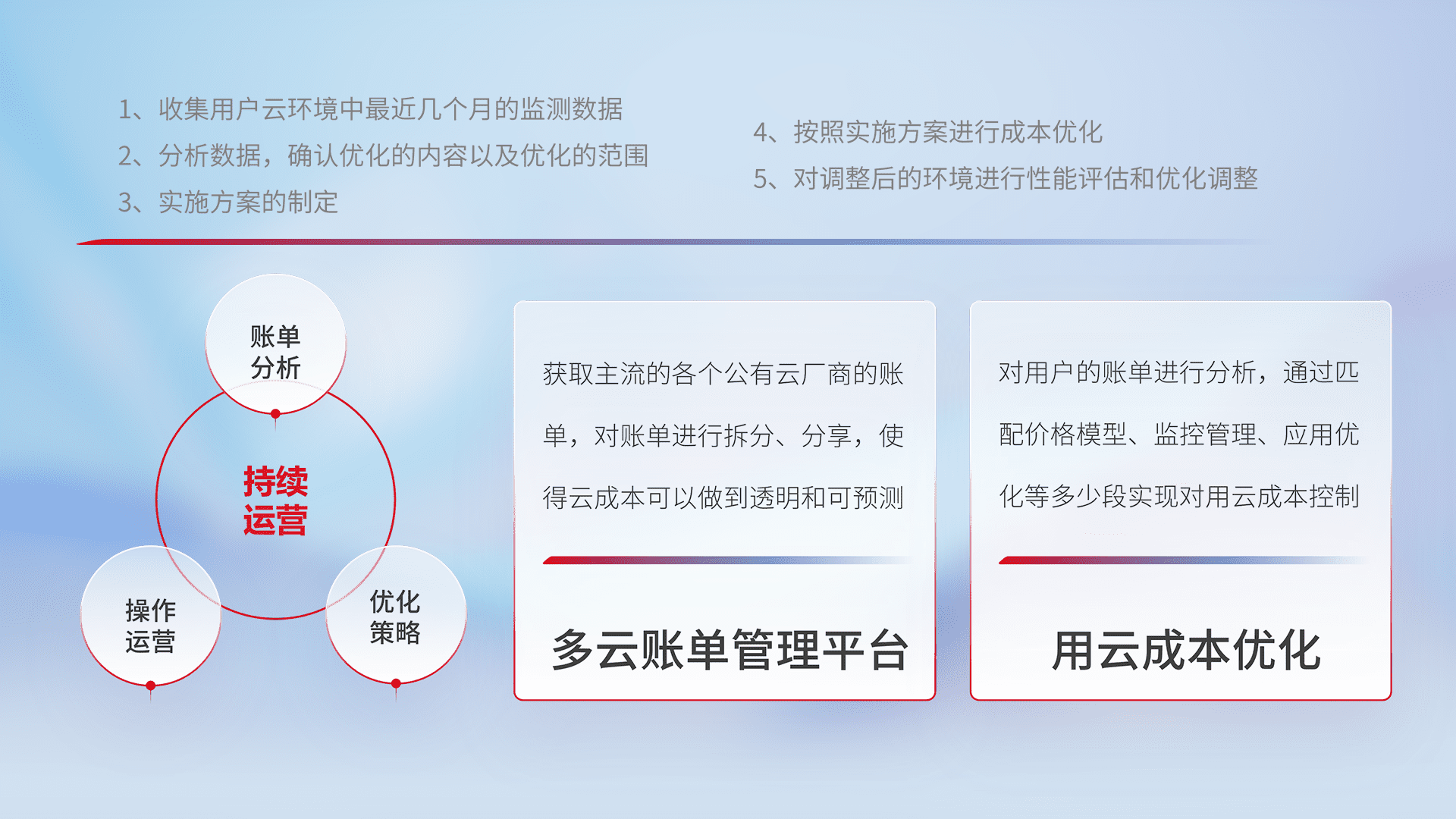 通过多云纳管,,,以统一的资源数据模型把客户的云资源进行抽象和封装,,,进而实现对多云资源的统一操作,,保障云资源管理的可靠性、、、、稳定性与可用性。。。量身定制化运维内容,,配置、、、、开发运维、、、补丁管理、、备份、、、、监控、、、认证和访问管理、、审计和日常巡检等,,保障在用云过程中的可靠度,,稳定度以及高可用率。。。
